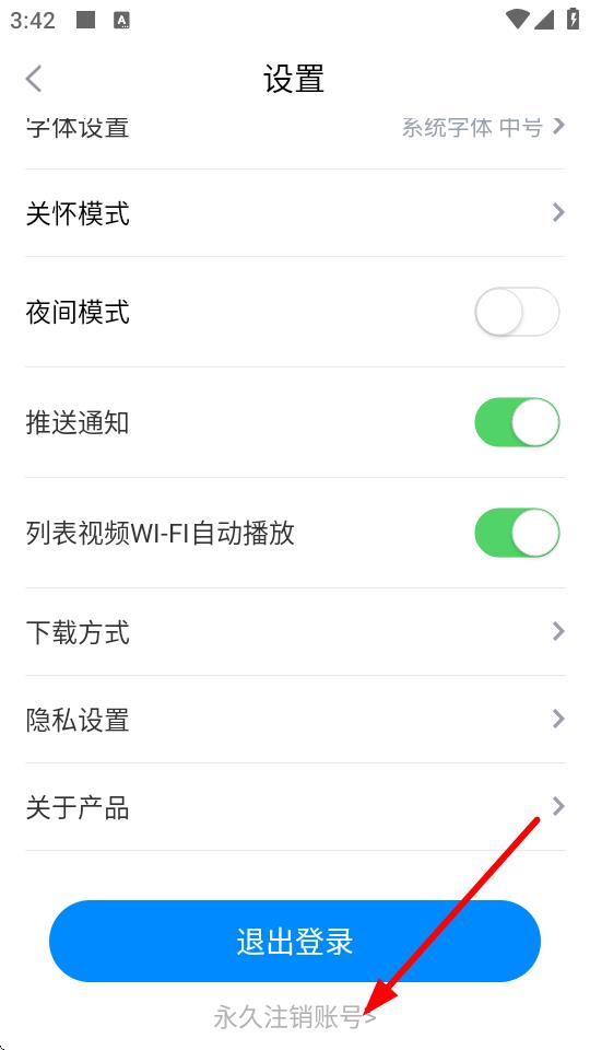 3、在设置页面里,下滑找到并点击永久注销账号选项。