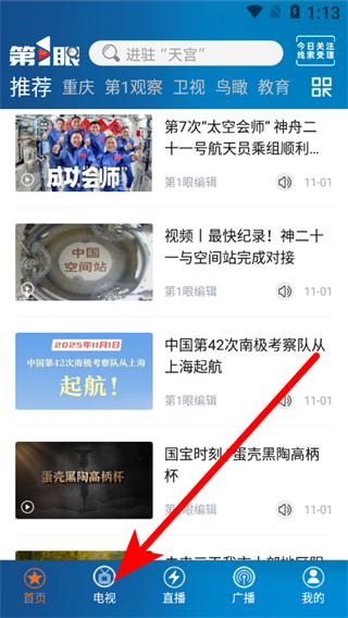 1、打开第1眼新闻App,点击底部导航栏电视选项。