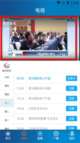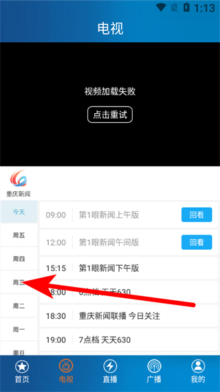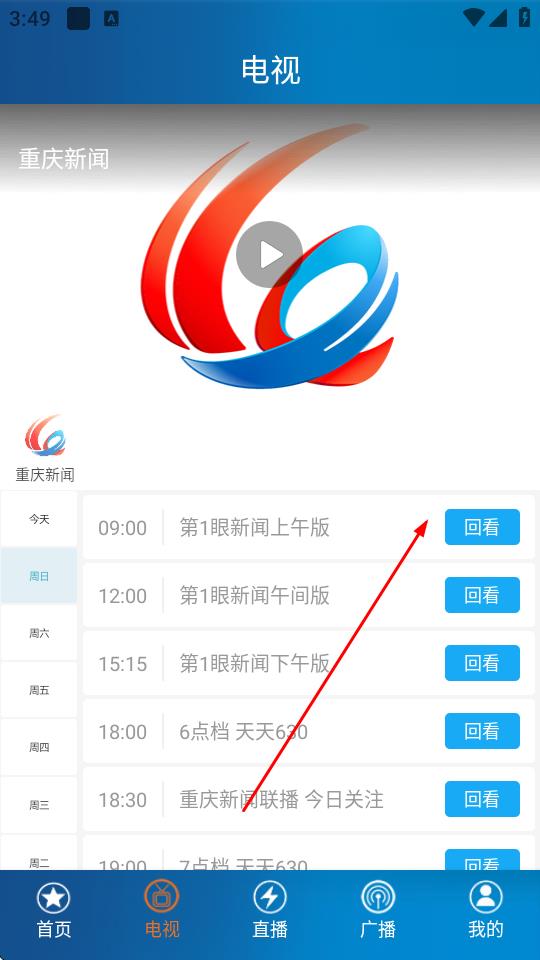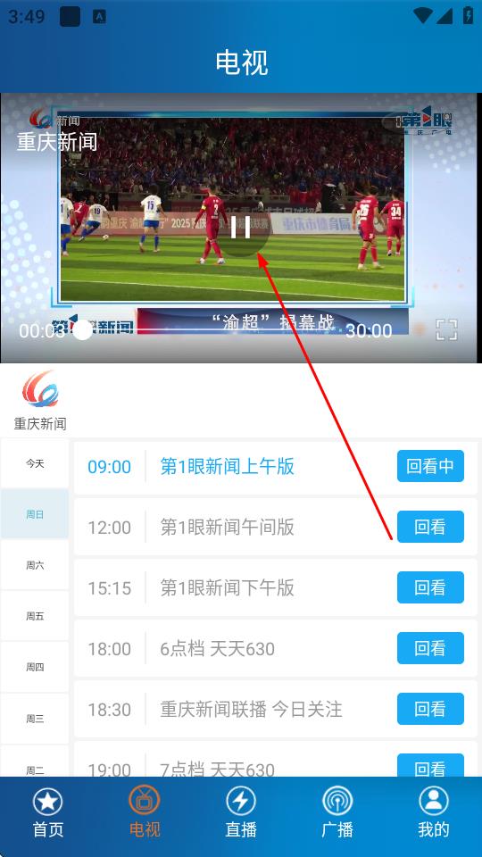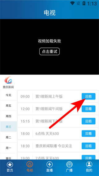3、在对应日期下,点击节目右侧的回看按钮,进入节目播放界面。