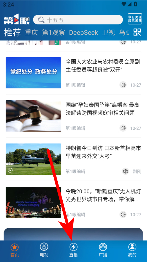 1、在第1眼新闻首页,点击底部直播选项,进入直播界面。