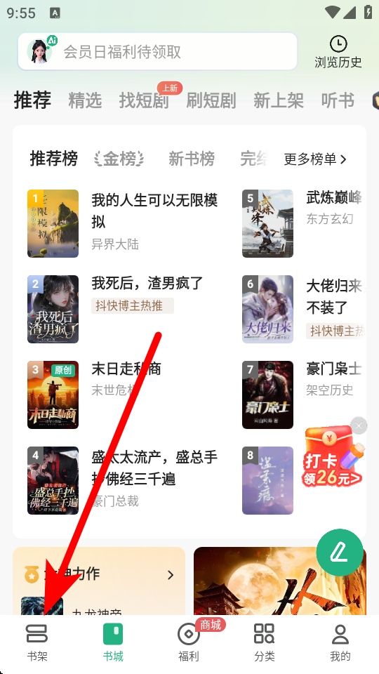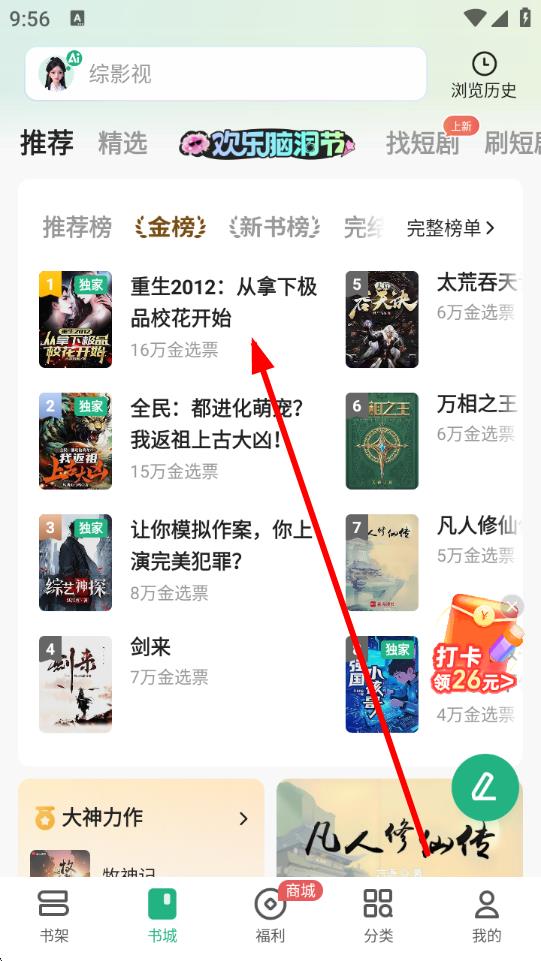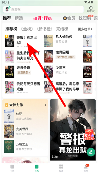 1、打开书旗小说APP,在首页点击书城,进入书城界面,这里有推荐榜、完结榜等多种榜单,可从中挑选想读小说。