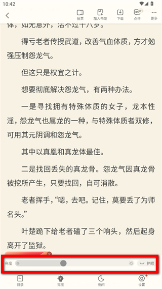 3、在亮度调节条上,左右拖动调节按钮,即可调整阅读界面的亮度。