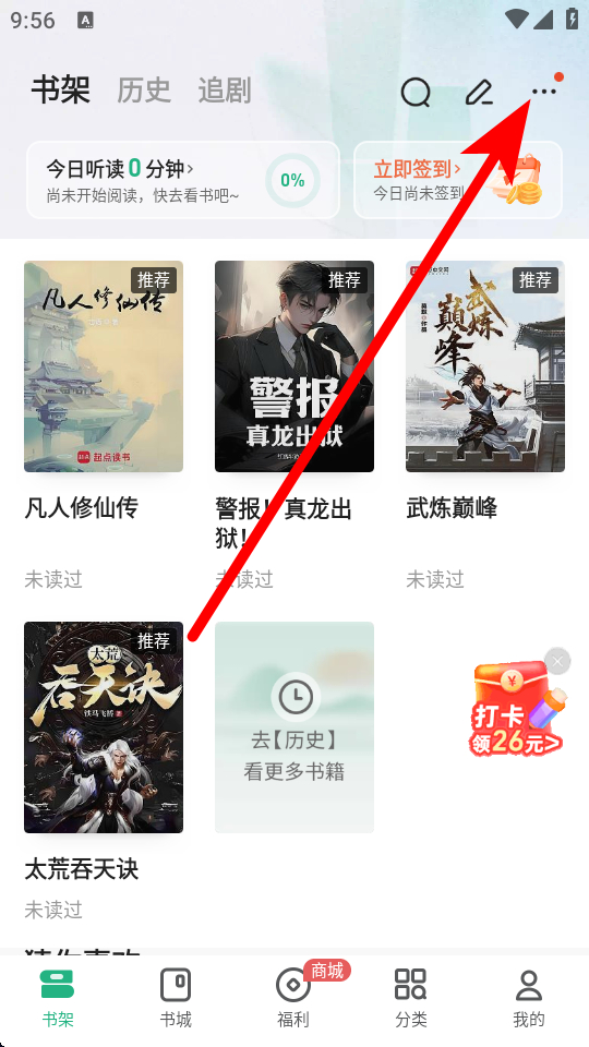 2、在书架页面,点击右上角三点按钮,弹出功能列表。