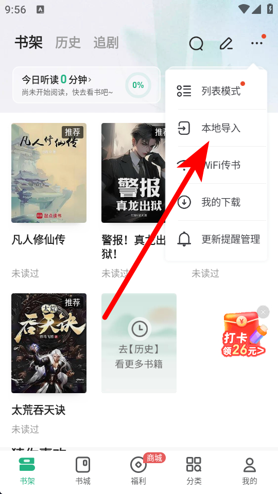 4、选择要导入的本地小说文件,点击导入书架按钮,完成本地小说导入操作。