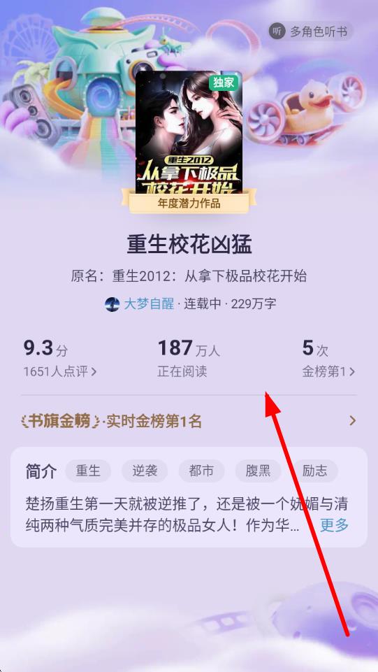 2、在书城榜单中,找到带有免费标识的小说,比如重生校花凶猛,点击小说封面进入详情页。