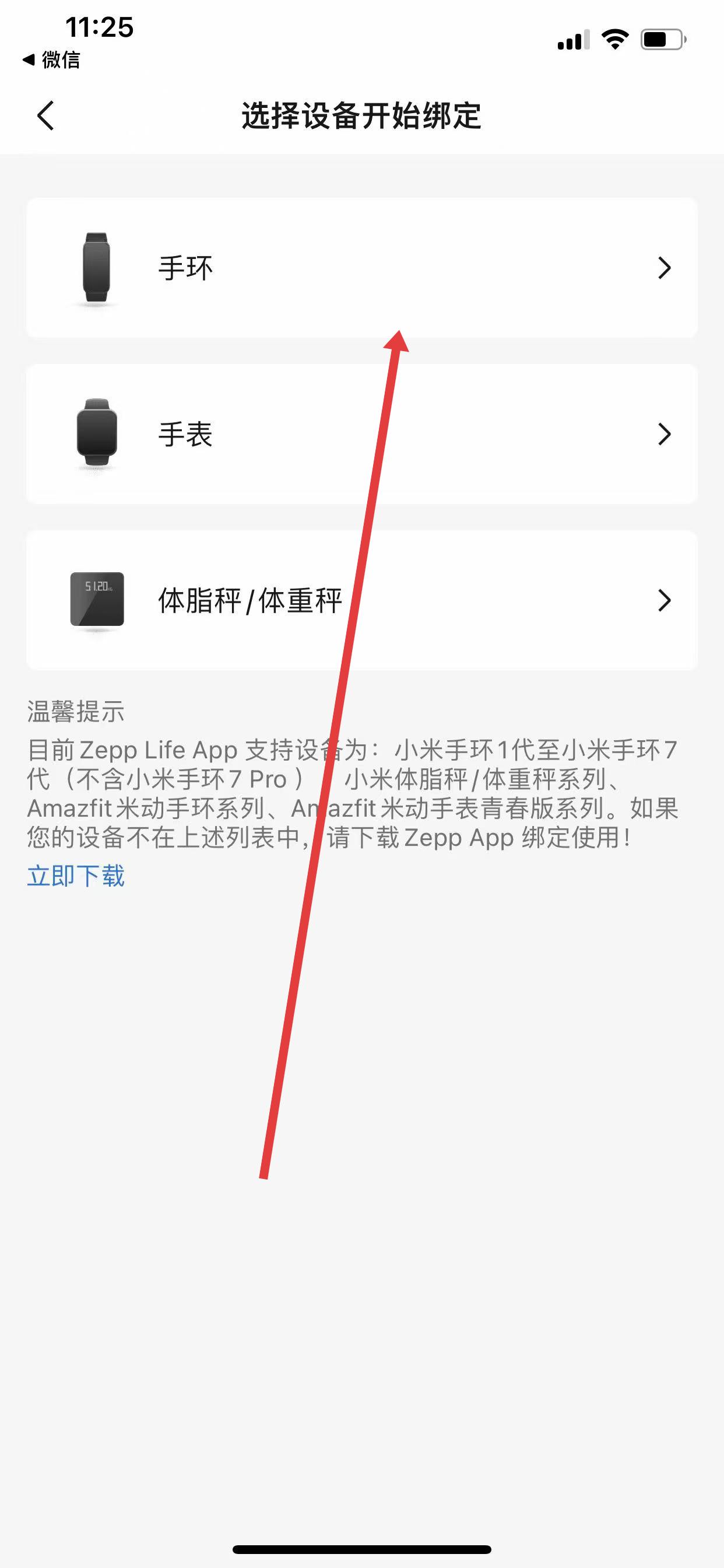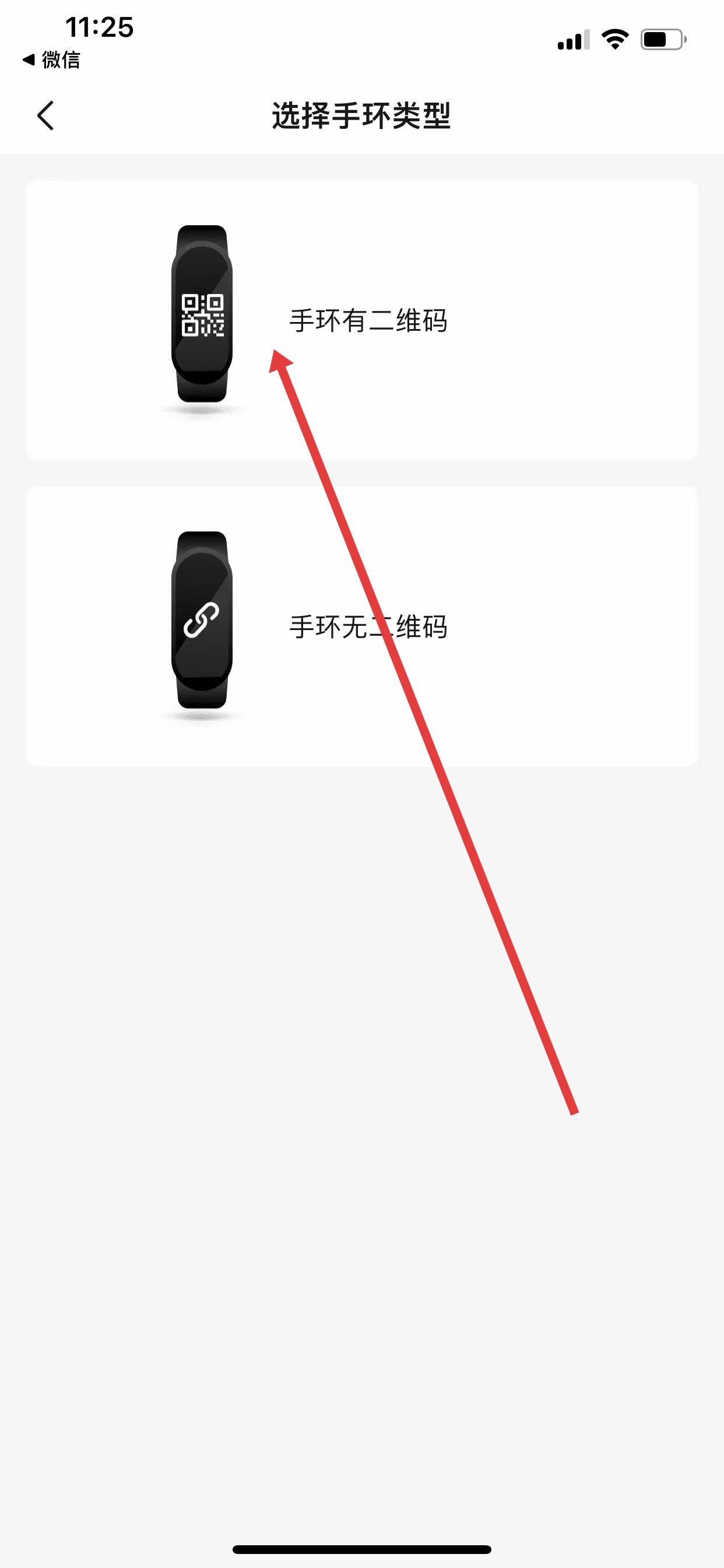 2、在设备选择界面,点击「手环」选项,按界面提示进入手环类型选择页面。