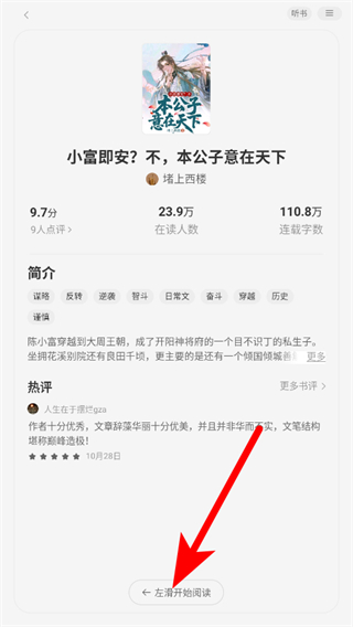 2、在书籍详情页面,点击左滑开始阅读选项,进入阅读界面。