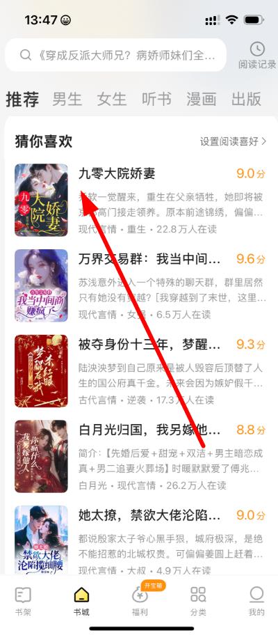 1、打开得间小说APP在书城的推荐等栏目中,选择想下载的小说,如《九零大院娇妻》,点击进入阅读界面。