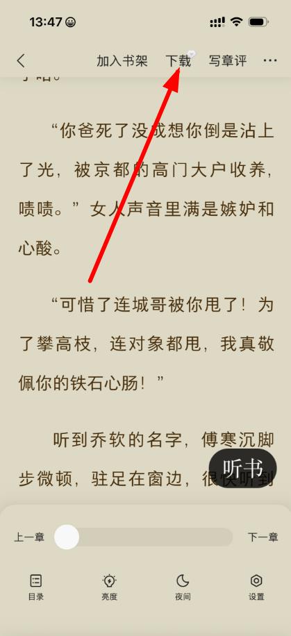 2、在小说阅读界面,点击屏幕上方,找到下载按钮并点击。