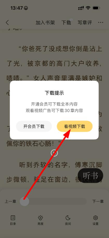 3、在弹出的下载提示窗口中,未开通会员,点击看视频下载,观看视频广告后可下载30章内容。