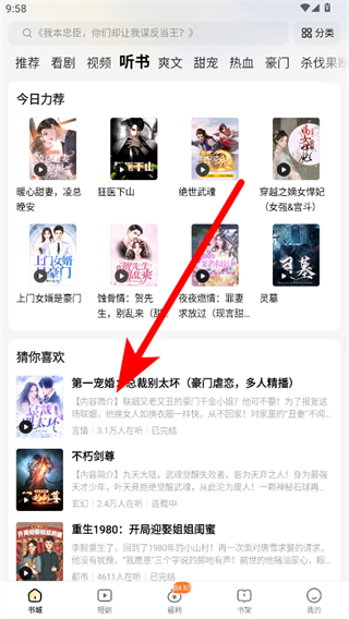 1、在得间小说书城页面,找到并点击想要调整语速的听书书籍。