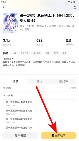 2、在书籍详情页面,点击立即收听按钮,进入听书界面。