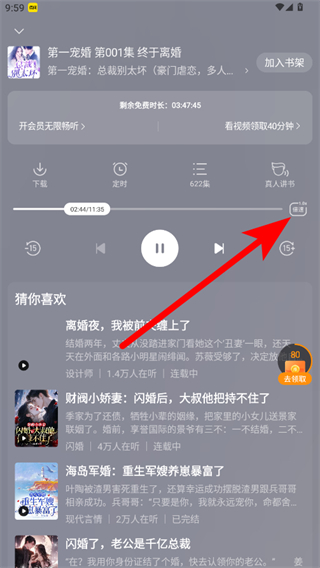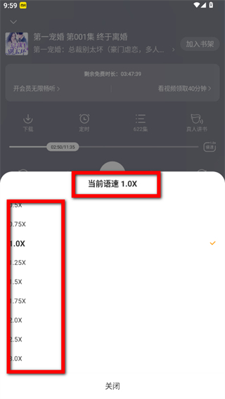 3、在听书界面,点击倍速选项,展开语速选择列表。