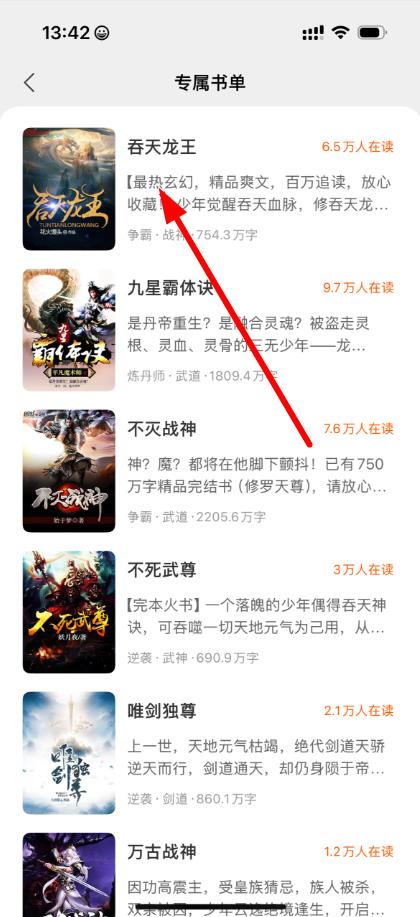 1、打开得间小说软件,在专属书单等界面中,选择一本想要听的小说,如《吞天龙王》,点击进入阅读界面。
