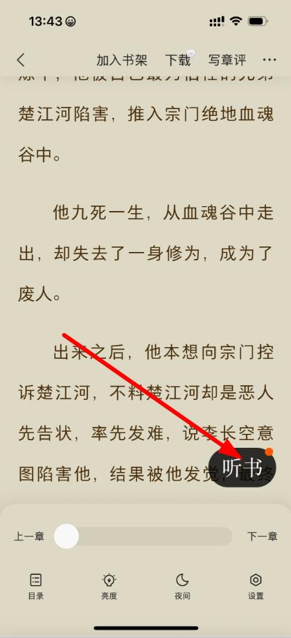 2、在小说阅读界面,点击屏幕,唤出底部功能栏,点击右下角的听书按钮。
