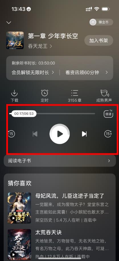 3、进入听书模式界面后,可按需操作播放、暂停,点击倍速调整语速,点击定时设置听书时长,点击上下曲按钮选择播放章节等。