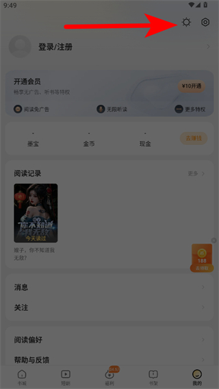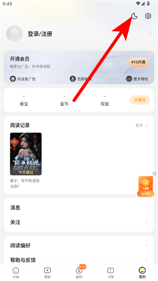 2、在个人中心页面,点击右上角月亮形状的夜间模式按钮,进入模式切换界面。
