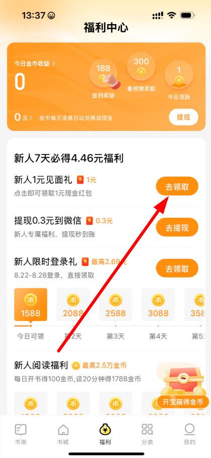 2、在福利中心,查看新人福利及日常任务,如新人1元见面礼点击去领取获得现金红包,完成签到奖励看视频奖励今日活跃等任务获取金币。