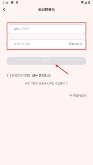 4、在验证码登录页面,填写手机号,获取并输入验证码,勾选同意协议后点击登录按钮,完成账号登录操作。