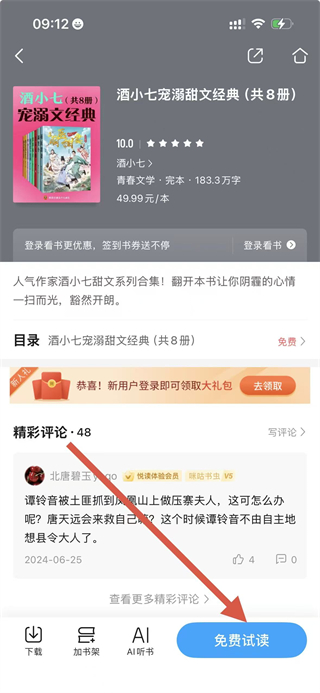 2、进入小说详情页后,点击免费试读按钮,进入阅读界面。