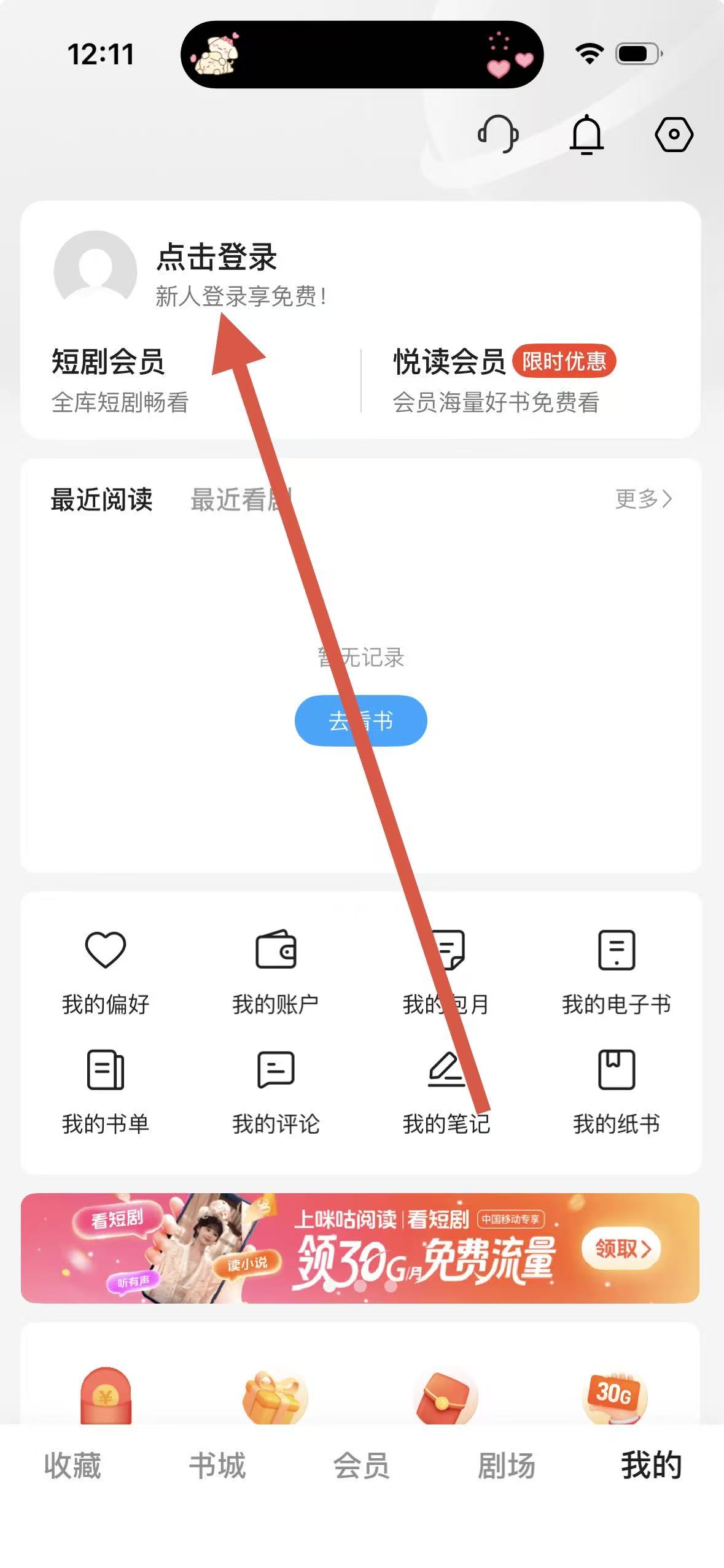 1、打开咪咕阅读APP,在首页点击下方我的选项,进入个人界面。