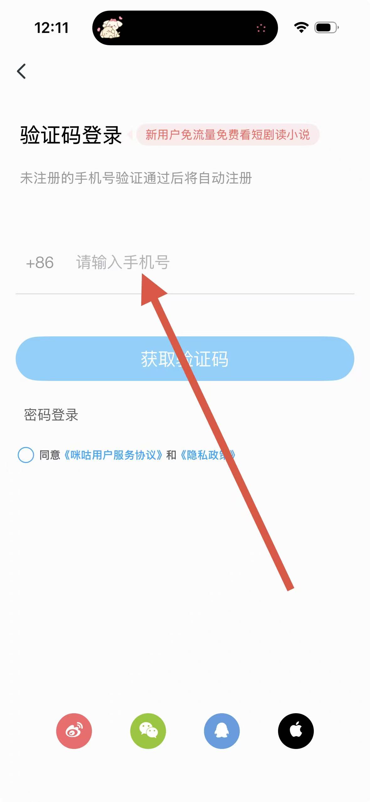 3、在登录页面选择验证码登录,并在手机号输入框中输入手机号。