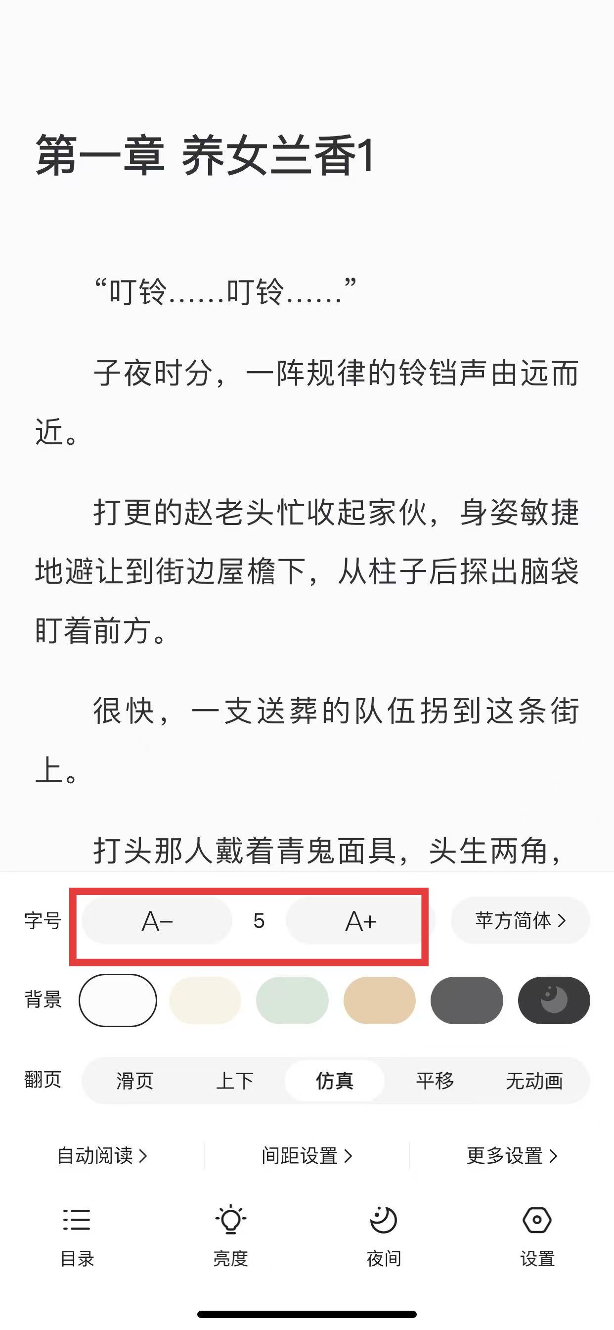 4、在设置菜单中,点击字号区域的A-或A+按钮,即可调整字体大小。