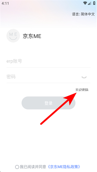 1、打开京东ME APP的登录界面,需要点击忘记密码按钮。
