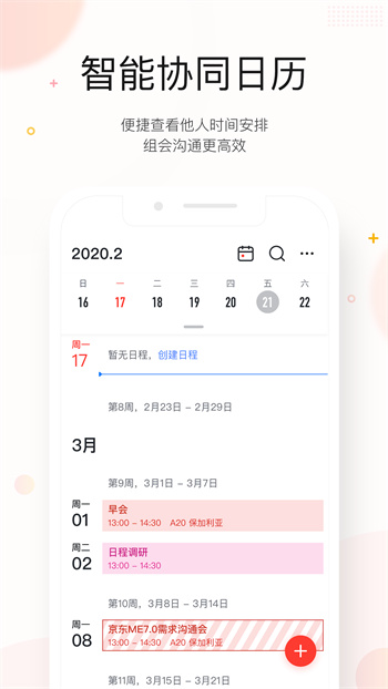 【日程】开放式日程管理平台,提供员工所有日常会议、项目的日程安排,快捷地进行时间管理和协同办公。