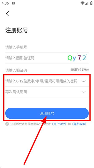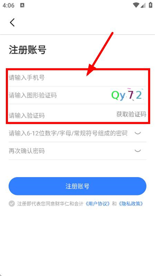 3、在注册账号页面,输入手机号、图形验证码,点击获取验证码并输入。