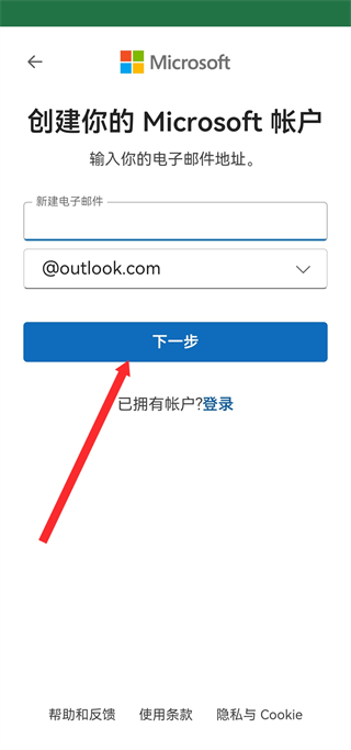 4、在页面输入电子邮箱地址,点击下一步,按照后续提示完成账户创建即可。