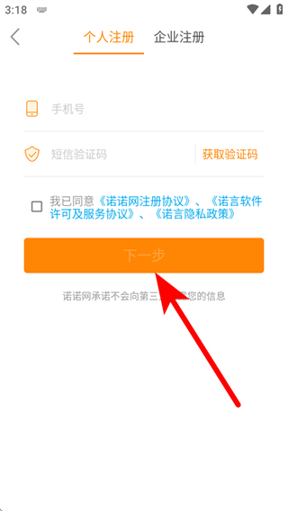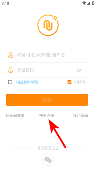 1、打开诺言APP的登录界面,我们需要点击快速注册。