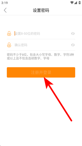 3、进入设置密码页面,设置密码点击注册并登录,完成注册操作。