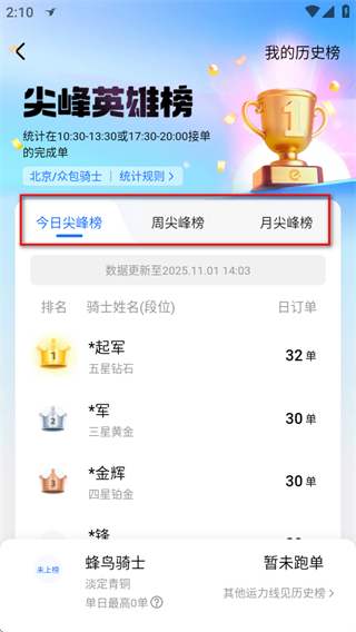 3、在我的历史榜页面,可查看今日尖峰榜等排名榜单,了解排名情况。