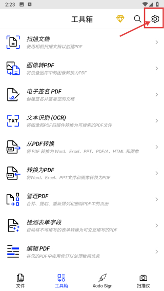1、打开PDF工具类APP,点击右上角设置图标,进入我的Xodo页面。