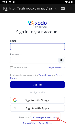 2、在我的Xodo页面,点击登录选项,进入账号登录注册页面。