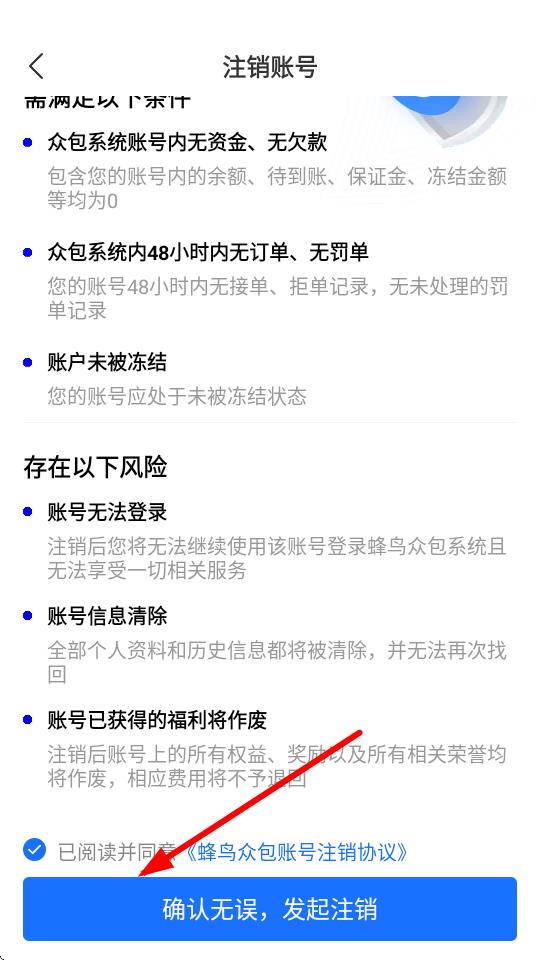 4、在页面勾选注销协议后点击确认无误,发起注销,完成账号注销操作。