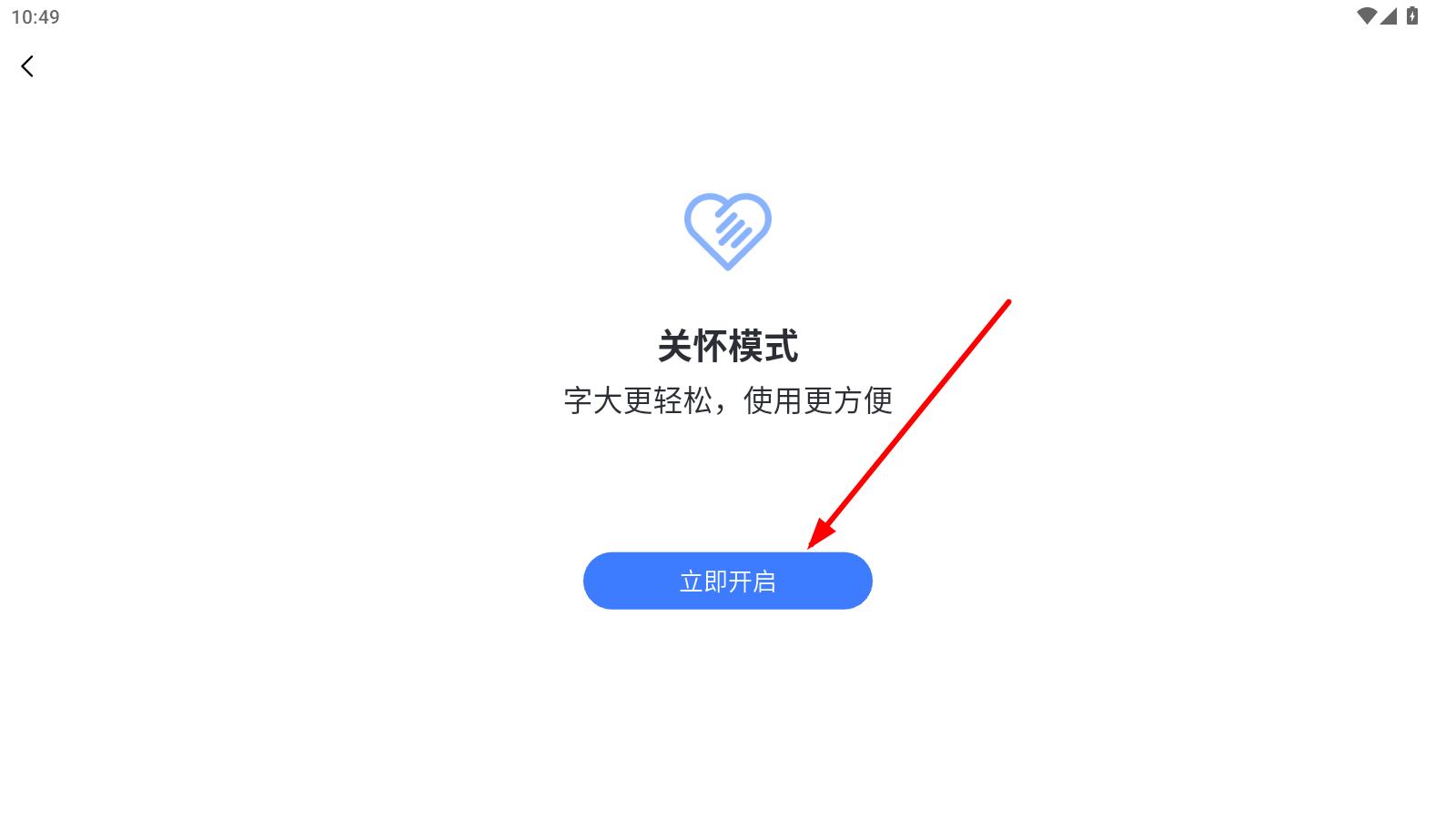 4、在关怀模式设置页面,点击立即开启按钮,即可成功开启关怀模式。