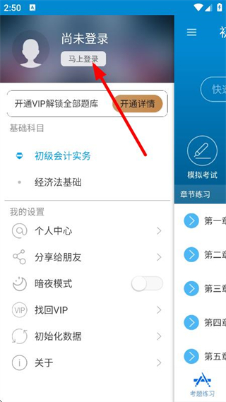 2、在侧边栏,点击马上登录,进入用户登录页面。