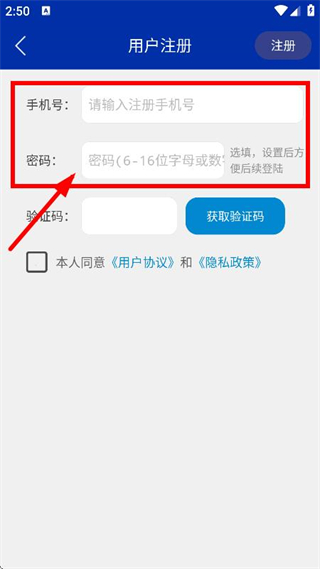 4、随后我们可以在用户注册页面,填写手机号和密码。