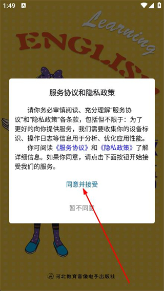 1、打开冀教学英语,在弹出的窗口中,点击同意并接受。