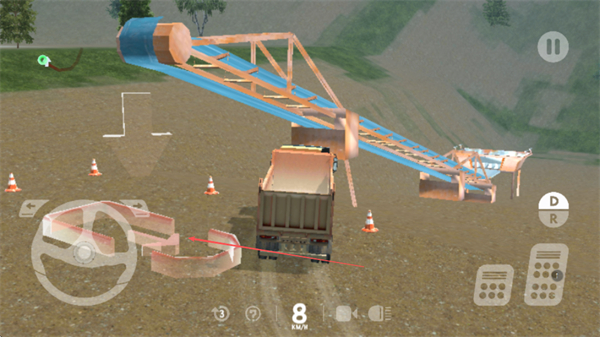 3、操作左侧方向盘,控制卡车方向,避开锥桶,向目标区域行驶。