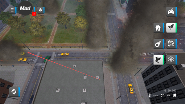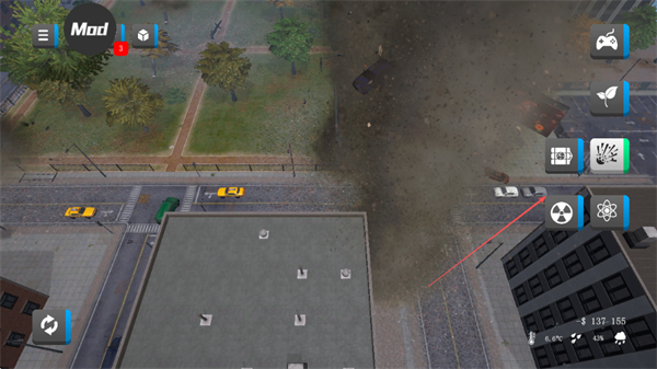 4、持续使用不同灾害工具,破坏城市的建筑、植被、交通等设施,不断积累分数,体验城市粉碎的乐趣。