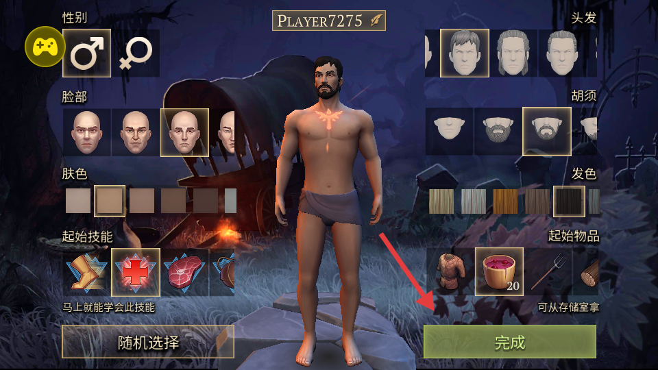 2、在角色创建界面,自定义性别、脸部、肤色、头发等外观,选择起始技能和物品,点击“完成”进入游戏,打造个性化角色。