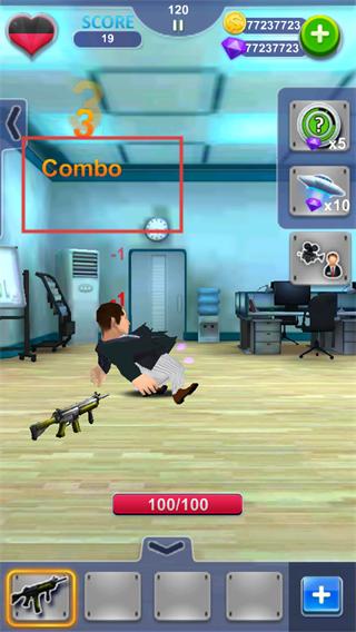 3、在战斗场景中,可选择不同武器(如枪械、飞镖等)攻击老板,积累分数和资源。