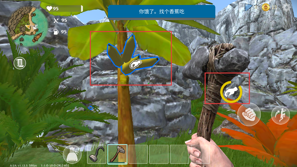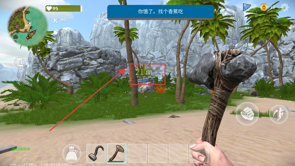 1、跟随任务提示“你饿了。找个香蕉吃”,在场景中寻找香蕉树,可查看到距离21M。
