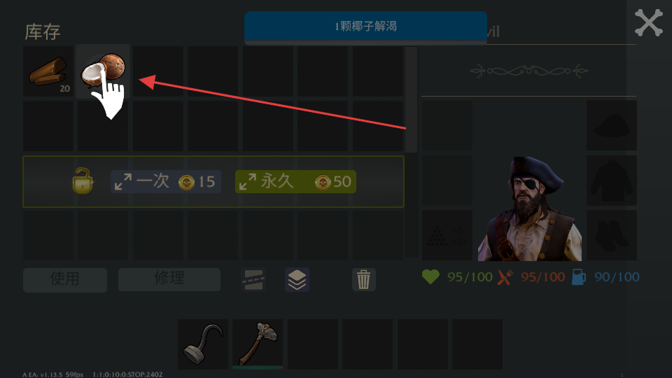 4、在库存界面,使用椰子等资源(如1颗椰子解渴),维持角色的生命状态,确保在岛屿生存中保持良好的体能。