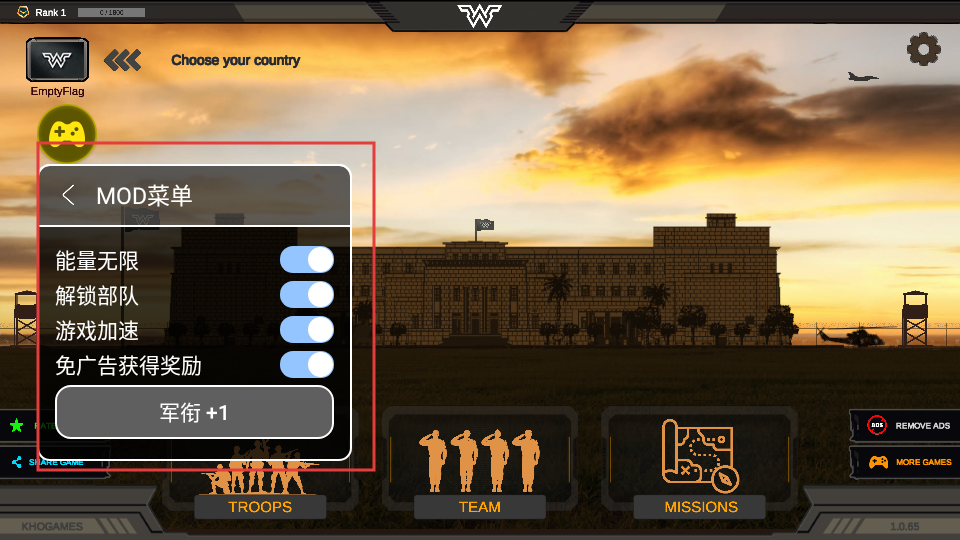 1、点击左上角游戏的标识,可打开MOD菜单中,开启“能量无限”“解锁部队”“游戏加速”等功能。