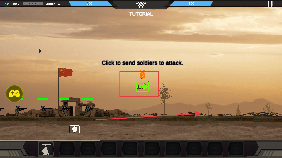 2、跟随教程提示,点击发送士兵的按钮,指挥士兵向敌人发起进攻,熟悉部队指挥操作。