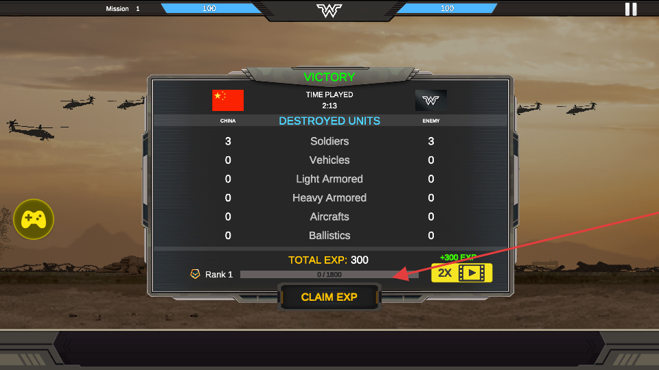 4、战斗胜利后,点击“CLAIMEXP”领取经验奖励,积累经验提升军衔和战力,继续挑战更高难度的任务。